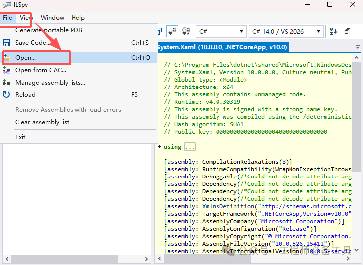 启动ILSpy,点击顶部菜单栏「File」→「Open」(或快捷键Ctrl+O);在弹出的文件选择窗口中,找到需要反编译的文件(.dll或.exe),选中后点击「打开」;加载完成后,左侧「Assembly Explorer」(程序集浏览器)中,会显示该文件的所有命名空间、类、方法,展开即可查看结构。在左侧程序集浏览器中,展开命名空间,找到你想查看的类(比如TcpServerCs);点击该类,右侧主窗口会自动显示反编译后的C#代码(默认显示C#,可切换);Tips:ILSpy的代码还原度很高,会尽可能保留原始代码的结构、变量名和注释,可读性极强,几乎和原始源码一致,不用费心修改就能直接使用。