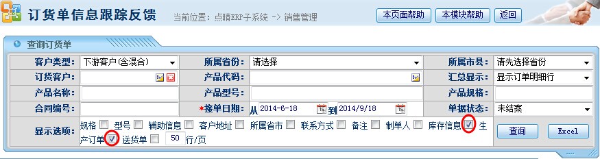 操作步骤:销售管理——订货单信息跟踪;进入页面如下图操作: 在此页面的“显示选项”勾选任意需要显示的信息,点击“查询”