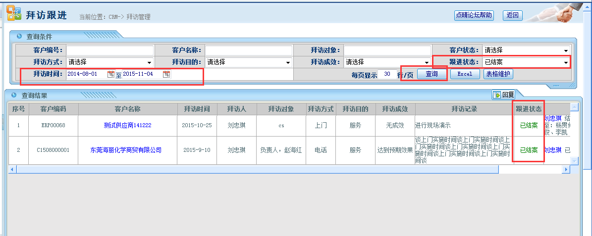 一种是正在跟进的记录、一种是已结案的记录,所以在查询历史拜访记录的时候注意查询条件