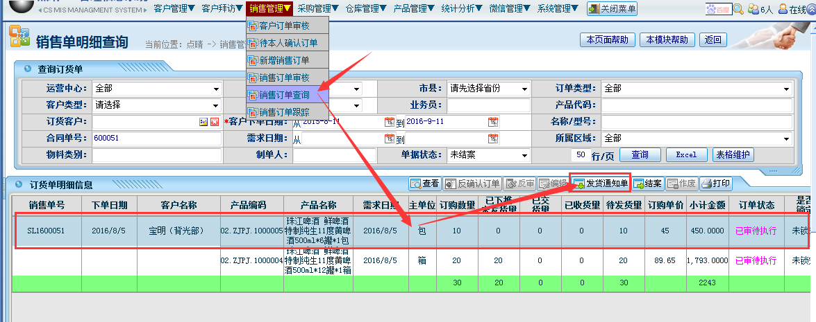 操作步骤:销售管理——销售订单查询——选择对应的销售订单——点击“发货通知单按钮”如下图所示: