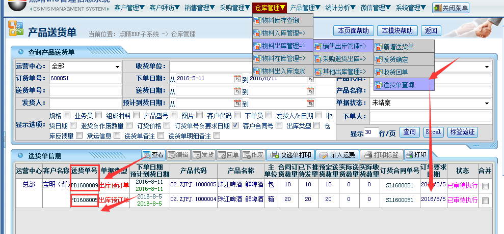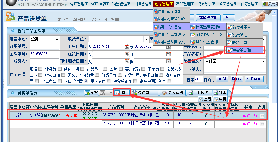 操作步骤:仓库管理——物料出库管理——销售出库管理——送货单查询——选择对应的单据——点击“作废”按钮