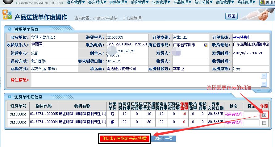 勾选需要作废的明细——点击“作废本订单指定产品及数量”;如下图所示: