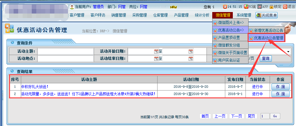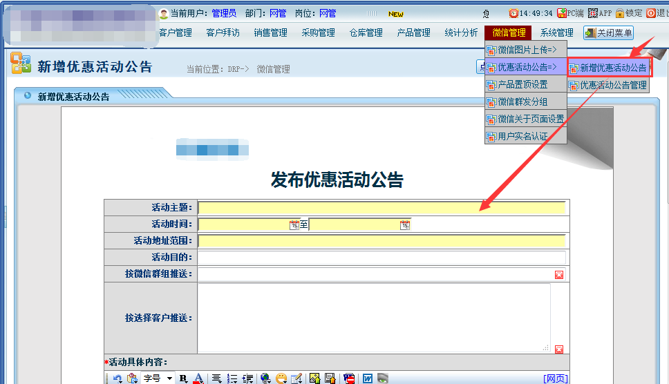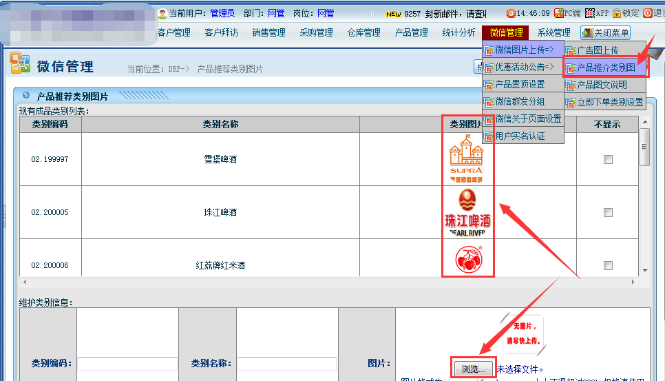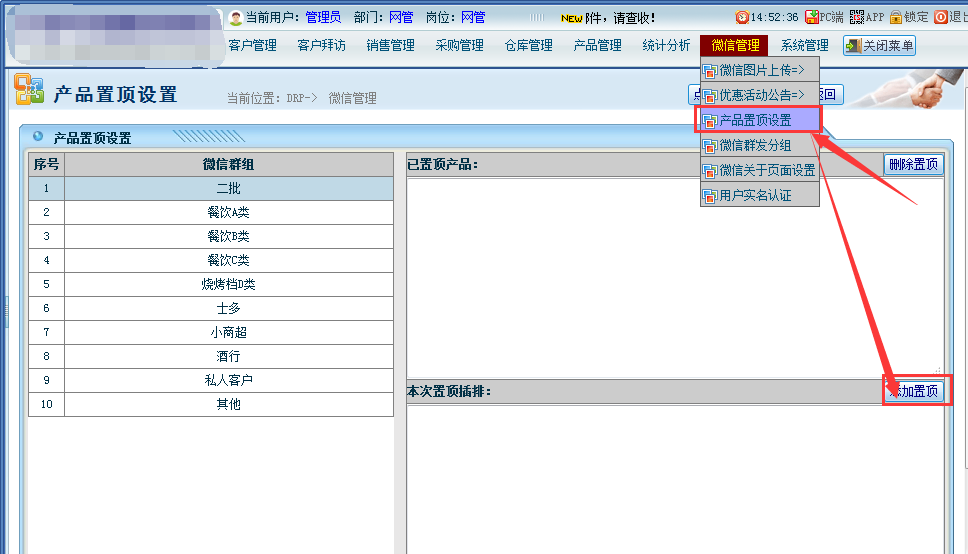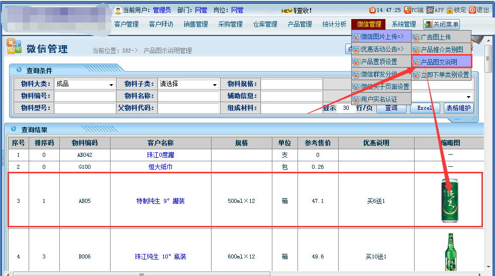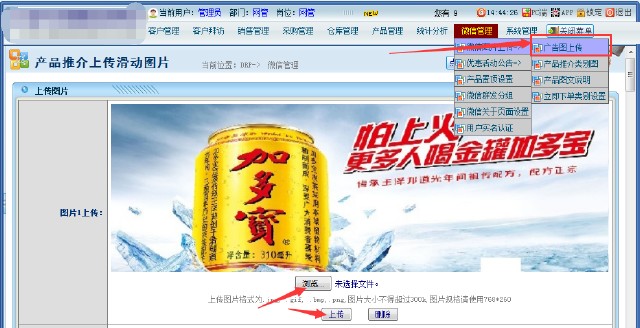 1、微信广告图上传PC端操作; 微信管理——微信图片上传——广告图上传——点击“浏览”按钮——选择对应的图片——点击“上传”按钮;如下图所示: 对应手机微信界面显示如下图所示: 2、产品推介类别图上传操作 微信管理——微信图片上传——产品推介类别图——选择对应的类别编码——点击“浏览”按钮——点击上传 对应手机微信端显示如下图所示: 3、产品图文说明录入操作; 微信管理——微信图片上传——产品图文说明——选择对应的产品——点击“编辑”按钮——点击浏览——选择对应的图片——点击上传:如下图所示: 对应微信端显示如下图所示: 4、微信优惠活动发布操作 微信管理——优惠活动公共——新增优惠活动公共——录入对应的内容——点击“提交”如下图所示: 对应微信端显示如下图所示: 微信管理——优惠活动公告——优惠活动管理;管理页面可对优惠活动进行查看作废;如下图所示: 5、产品置顶设置 微信管理——产品置顶设置——选择对应的群组——点击“添加置顶”按钮——选择对应的产品——完成;如下图所示: 6、微信群发分组 微信管理——微信群发分组——选择对应的微信群组——点击添加绑定——添加对应群组的客户名称——完成。 该文章在 2016/9/20 15:21:25 编辑过 |