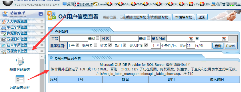 请问工作流和万能魔表两个管理模块的自定义SQL数据源如何实现排序效果?现在总是报错80040e14,除非另外还指定了TOP或FORXML,否则ORDERBY子句在视图、内联函数、派生表、子查询和公用表表达式中无效。​这个提示很清楚,就是自定义的SQL语句有语法错误,当在自定义的SQL中使用了orderby自定义排序时,...