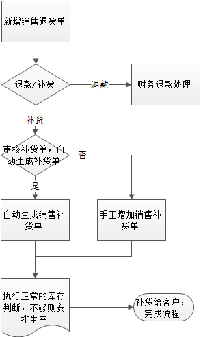 ERP销售单退货自动形成补货销售订单操作注意事项 操作步骤1、做销售退货单,操作参考对应教程:新增销售退货。注意新增时选择“补货”选项,如下图所示:2、审核销售退货单,操作参考对应教程:审核销售退货单 注意需要勾上自动形成补货订单按钮,如下图所示: 按上述操作完就能在销售管理界面形成一份新的销售补货订单了
