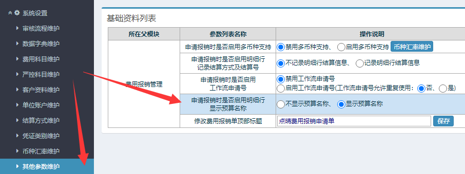 点晴EBR报销申请单明细如何显示预算名称?以管理员身份进入EBR系统,找到系统设置-其他参数维护-显示预算名称启用。启用后,申请界面会显示预算名称: