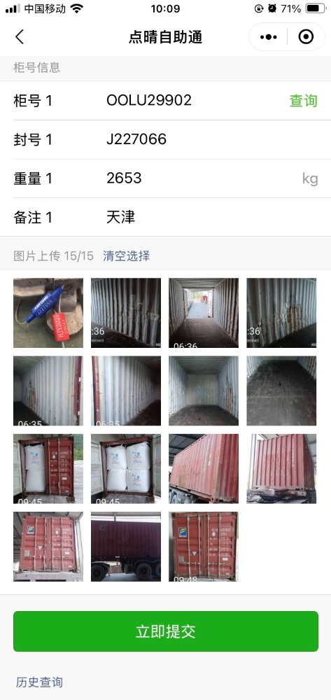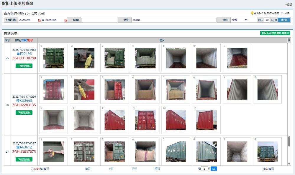 如果采用点晴集装箱装柜拍照上传小程序(介绍网址:http://www.hgtp.cn),那么拍照完毕后就可以立即通过微信小程序上传到服务器,之后货主或承运商等相关人员可以立即在网上登录到点晴货柜图片管理平台查询到相应的集装箱装柜图片,支持直接图片下载、图片rar压缩打包下载、图片组按照指定格式生成PDF文件下载等,公共查询网址:http://hgcx.oa22.cn。